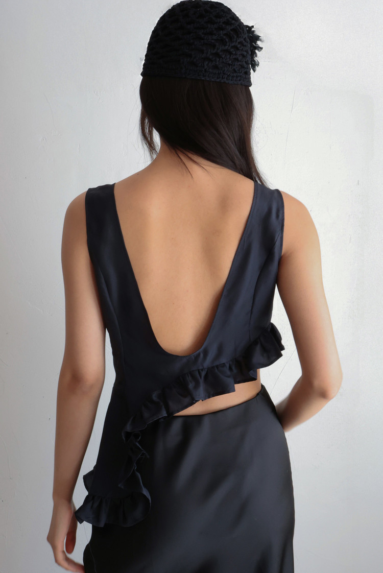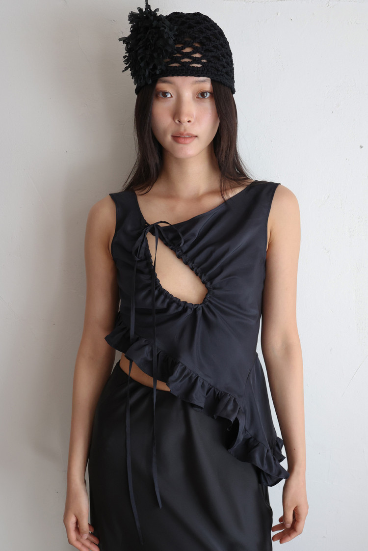Cut Shirring Silk Top -Navy